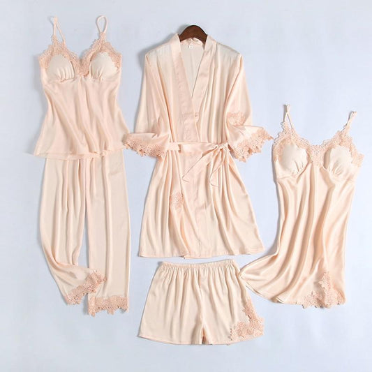 Women Pajamas Suit Satin Sexy Sleepwear Summer Pyjamas With Trousers Nightgown V-Neck Kimono Robe Gown Set Lingerie